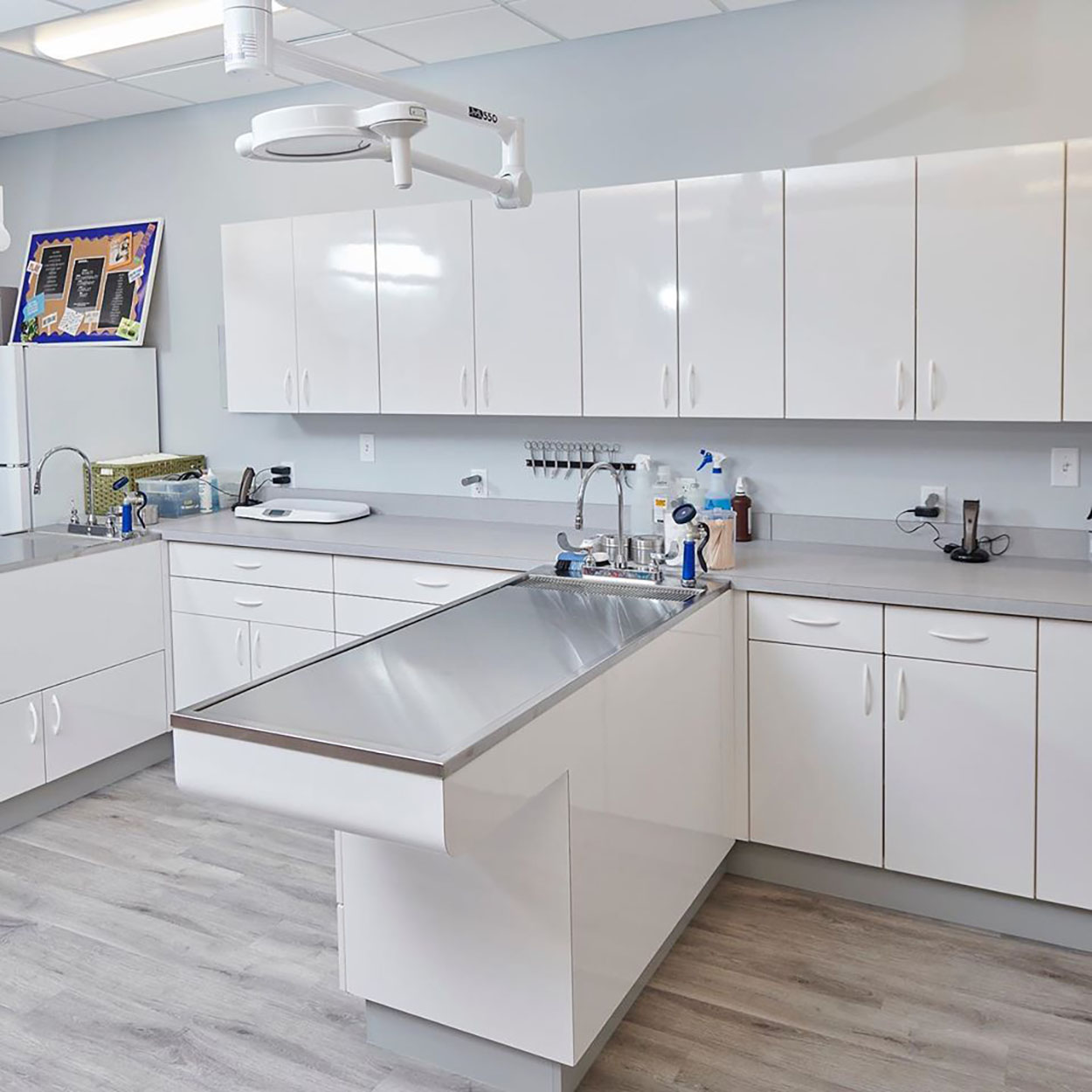 Designed to create a happy front-of-house environment, and a warm, calming back-of-house environment, EMMAvet is nestled in the heart of Alexandria and specializes in pet emergencies. Their open concept allows for more pets to be seen quickly and ensures that no pet is ever alone during their time spent there. Designed by Bridgeworks Corp, calming blue and gray neutrals were used throughout – utilizing AVA DSGN for its modern wood look and durability.
