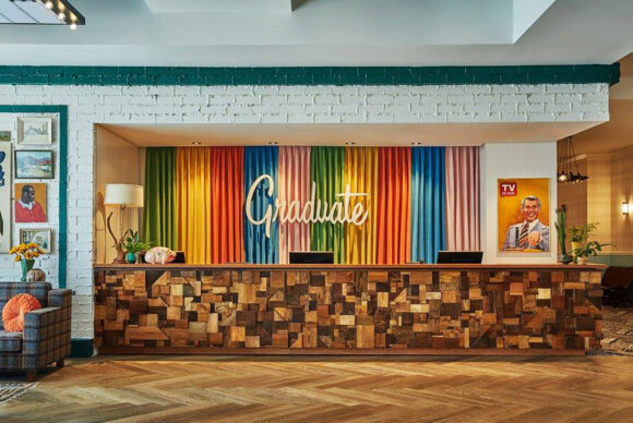 According to CCO Andrew Alford, “Each graduate Hotel is as unique as the city in which it resides”. The Graduate Lincoln Hotel draws inspiration from its’ home state of Nebraska, featuring everything from corn patterns used as tropical motifs to brick walls inspired by the Haymarket warehouse district nearby. With the interiors designed by AJ Capital Partners, one can find locally sourced art collections, Greyne and Capri Cork flooring finishes, and eccentric patterns, prints and rich textures incorporated throughout the interior design.